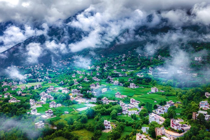 云雾缭绕的基卡依村美如仙境。丹巴县委宣传部供图