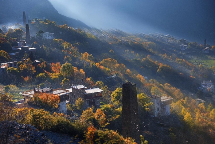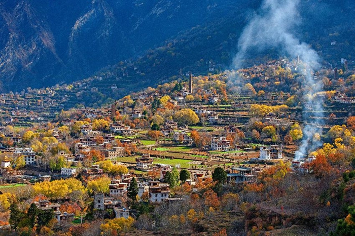 深秋,丹巴基卡依村彩林叠金。丹巴县委宣传部供图