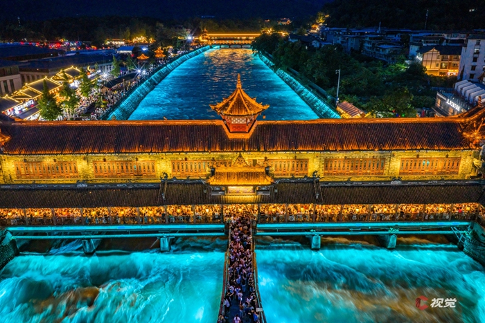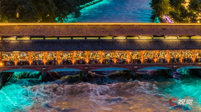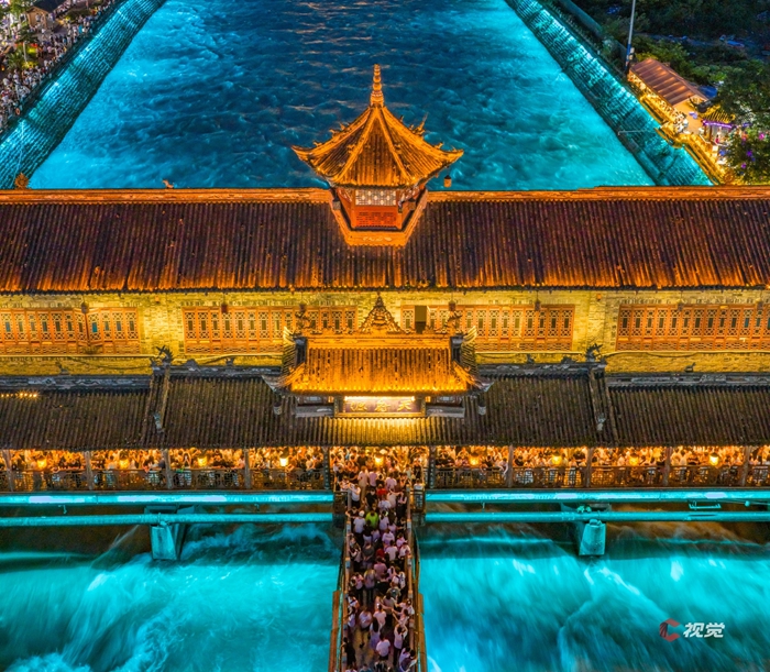 盛夏之夜,成都都江堰标志性景点宝瓶口、南桥、天府源廊桥等周围,青蓝色的霓虹灯绚烂亮起,岷江之水从桥底流过,仿佛繁星银河落于此间,又似蓝色眼泪在缓缓流淌,这一绝美景致每晚吸引了许多游客前往打卡留念,熙熙攘攘更添烟火气息。