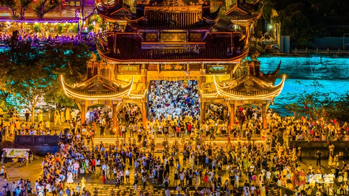 7月23日夜,俯瞰都江堰宝瓶口梦幻“蓝眼泪”。