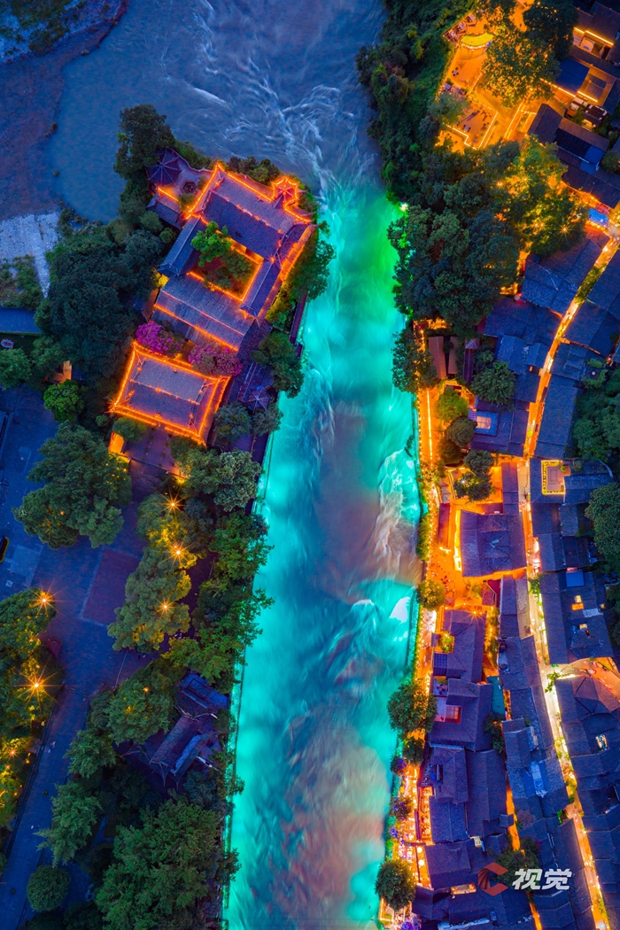 盛夏之夜,千年古堰灯光亮起,梦幻的蓝色江水缓缓流淌而过。
