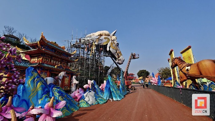 1月10日,第三十二届自贡国际恐龙灯会的举办地——中华彩灯大世界内,施工正酣。记者走进园区,探寻本届灯会中备受期待的“生肖”主题灯组。在曾诞生过“生命之树”“精卫女神”“青城双姝”等网红灯组的第14标段,一个以马为核心、讲述木兰传奇的巨型灯组正在紧张制作,它将承载起人们对农历马年的美好期盼。