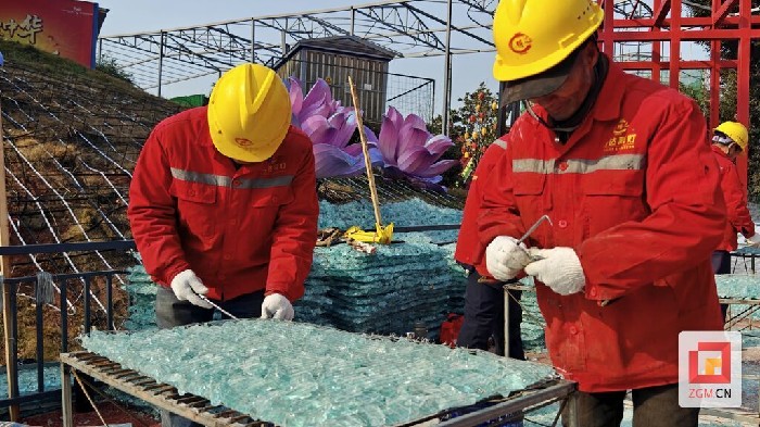 为融入自贡深厚的盐文化底蕴,设计团队计划在灯组草地上铺设一片晶莹的“盐晶”地面。然而,材质选择成了首个难关。“直接用食盐会融化,无法持久。”现场负责人温易桃解释道,经过反复试验,团队最终选用了天然绿色玻璃石替代,这也是自贡灯会首次采用该材料。